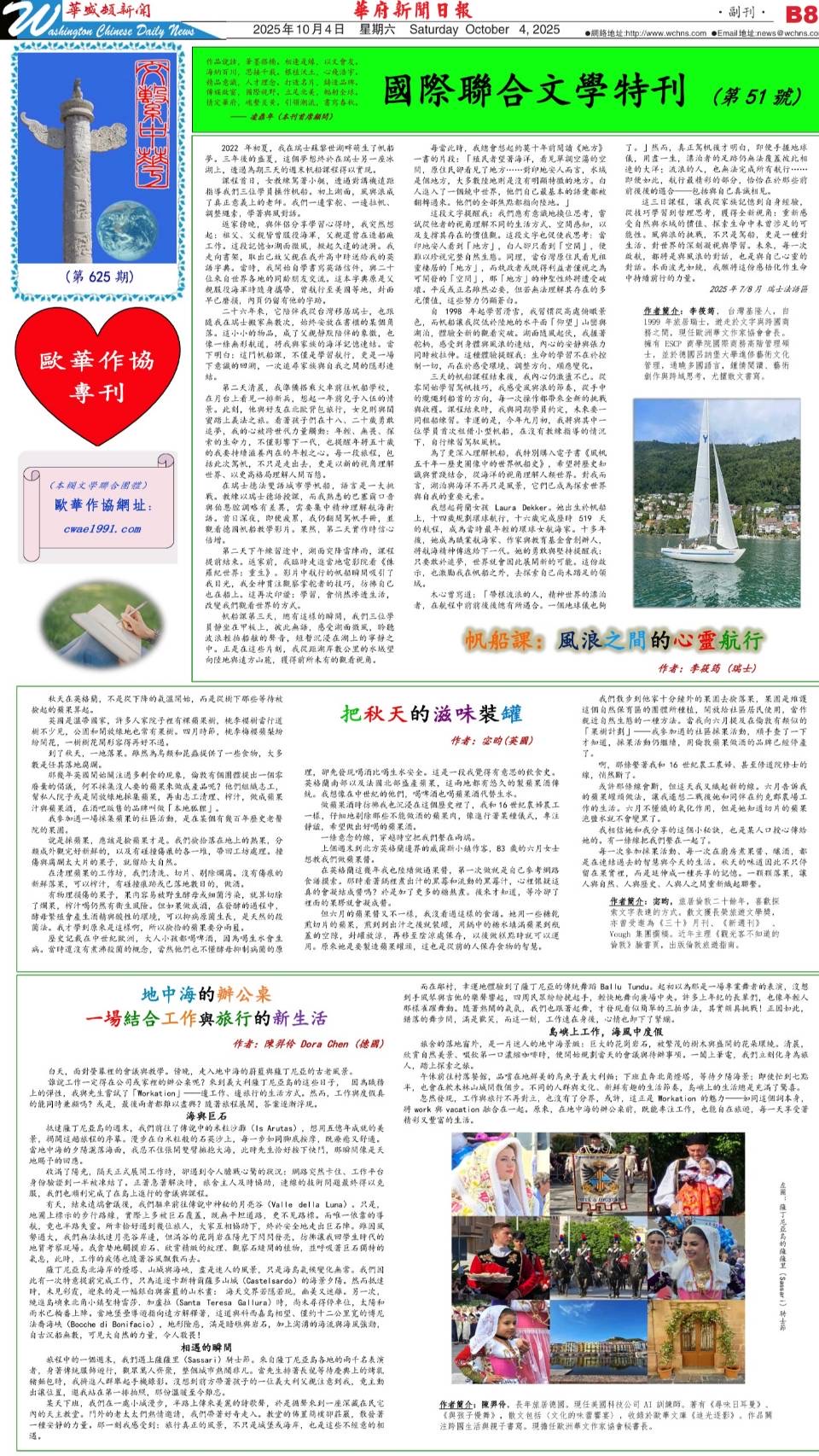 《文繫中華國際特刊》第625期(2025年10月4日)【歐華作協專刊】已於《華府新聞日報》正式上線,邀您一同感受來自歐洲華文作家的筆觸與心靈風景。
